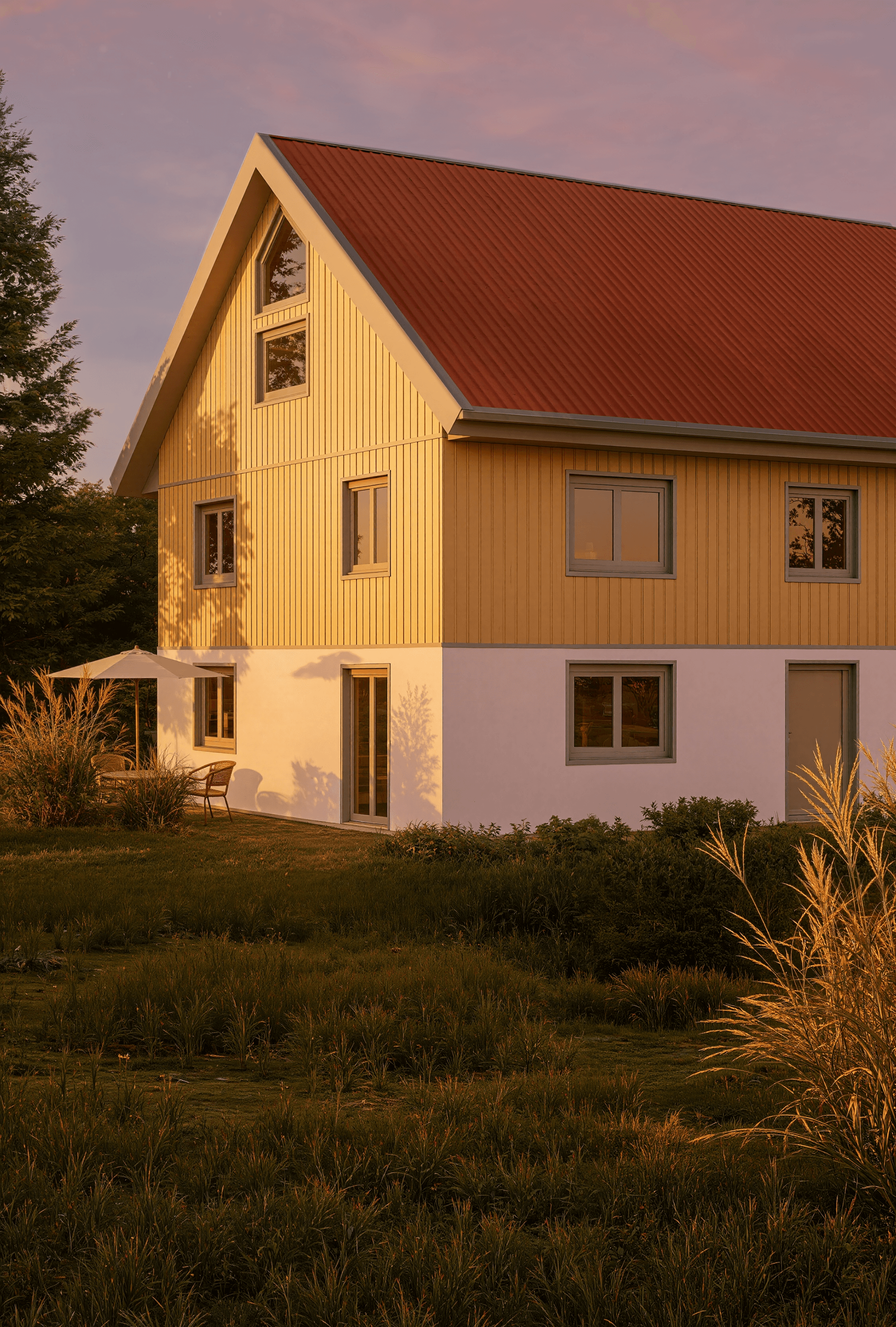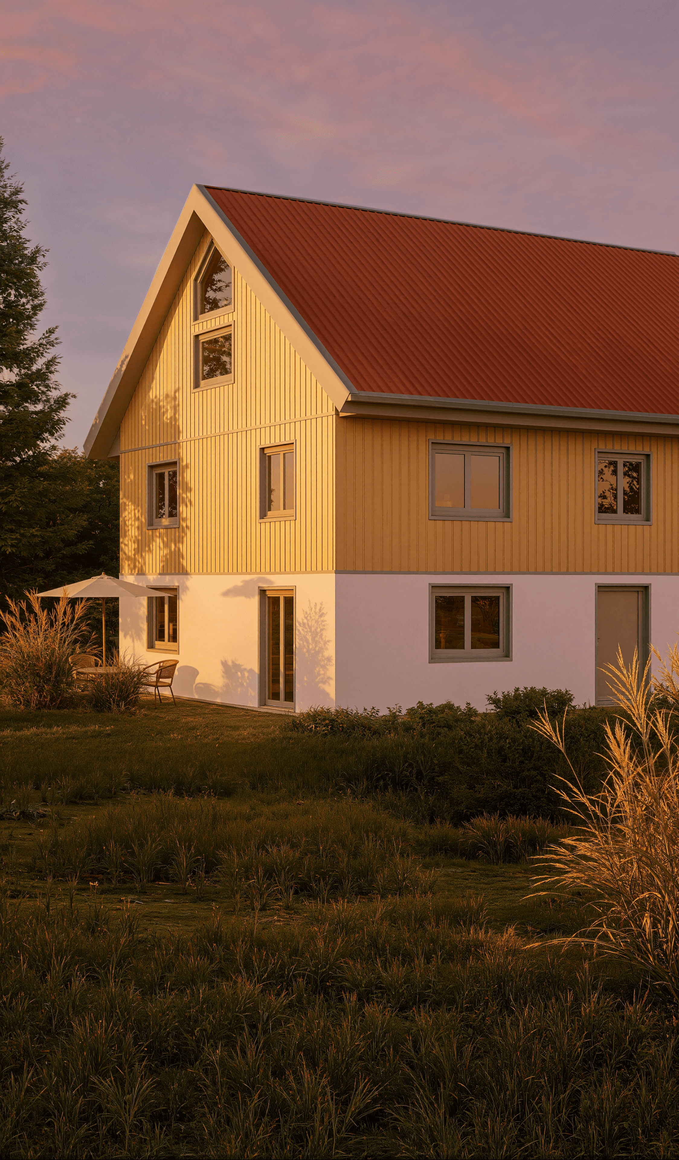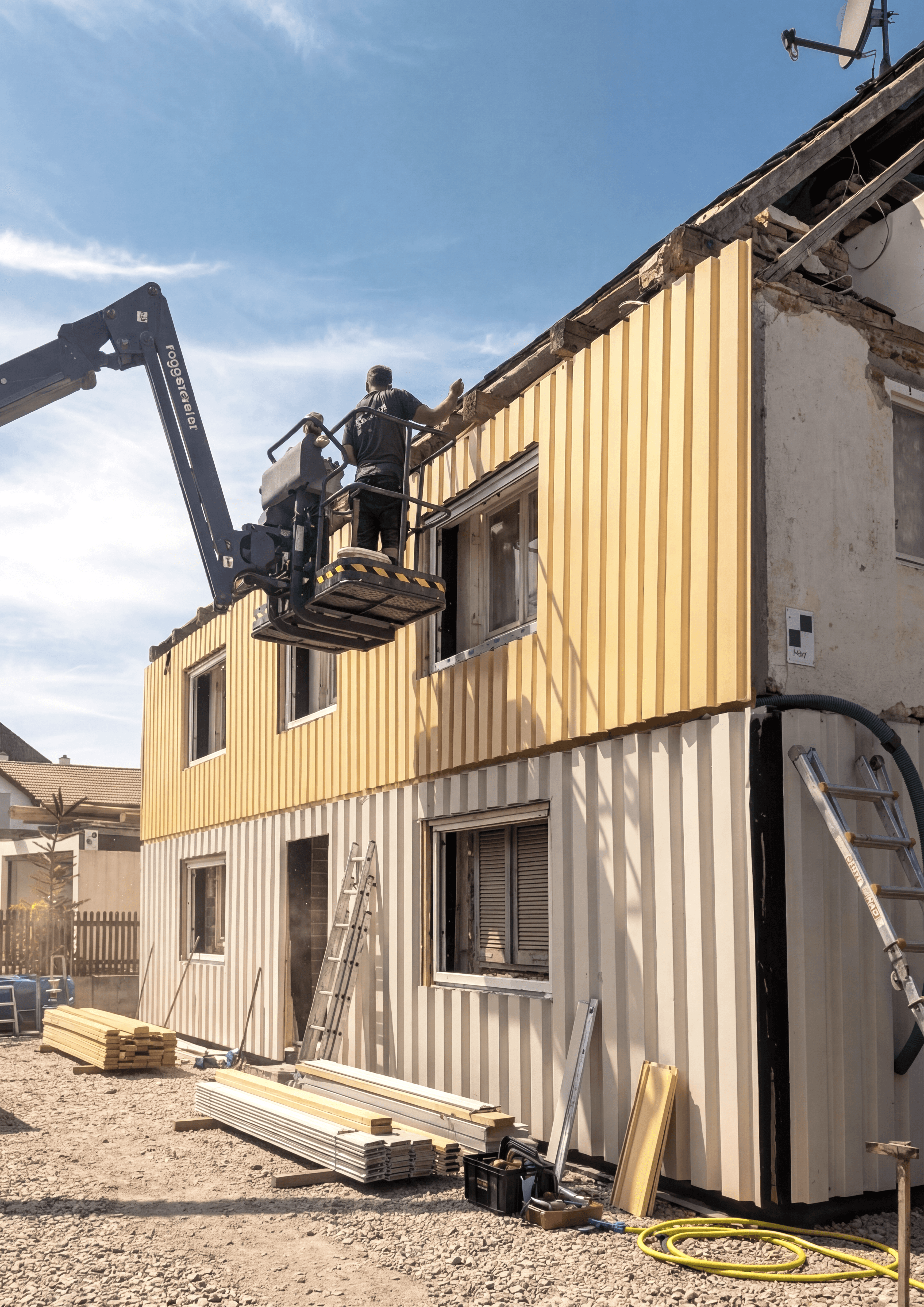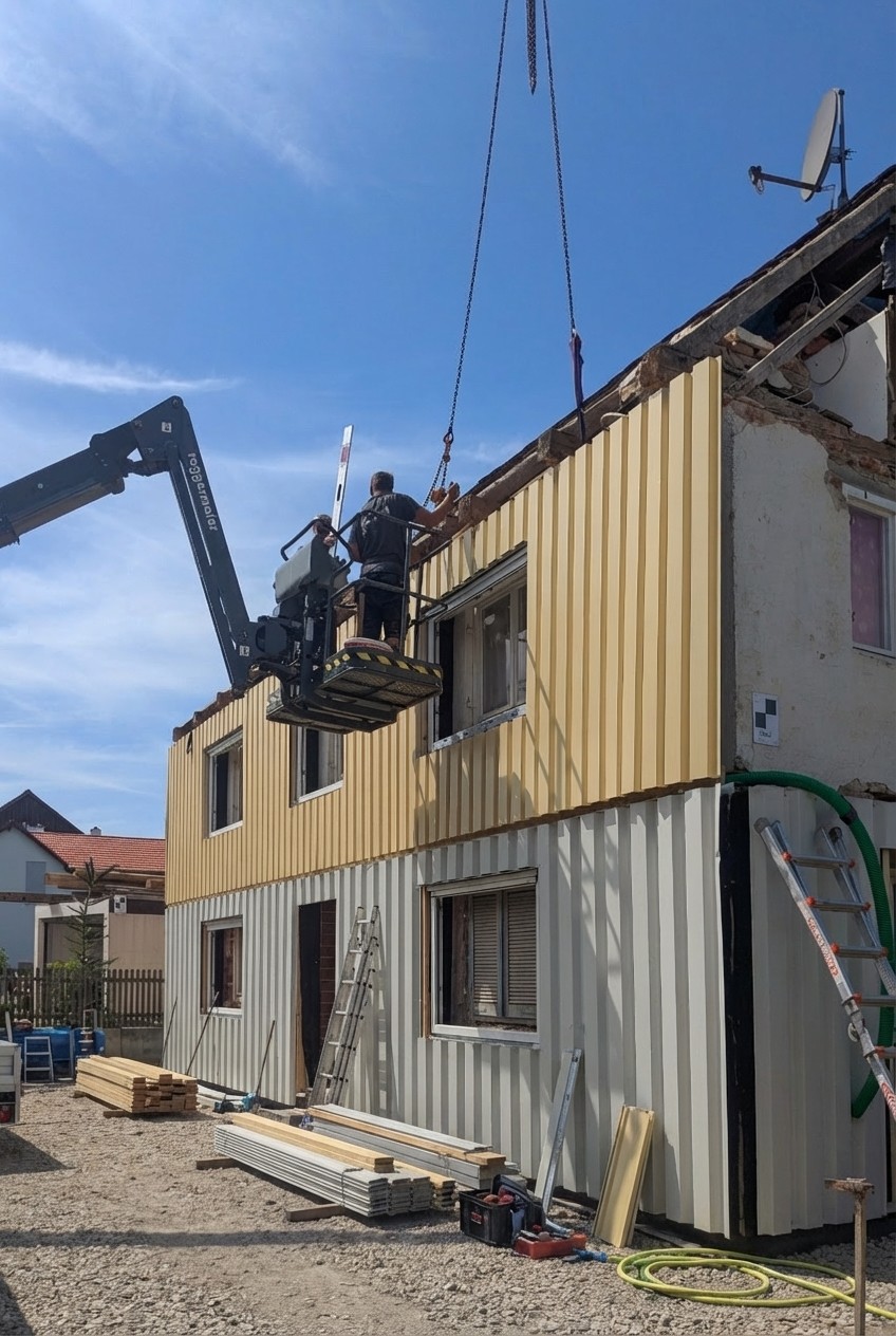 Im Sommer 2025 konnte das erste Projekt mit der neuen dcarbonize Fassade erfolgreich realisiert werden: Im Zuge einer Kernsanierung erhielt ein Einfamilienhaus eine vorgefertigte Gebäudehülle mit Trapezblechfassade, die unseren neuartigen Ansatz erstmals in der Praxis demonstriert.