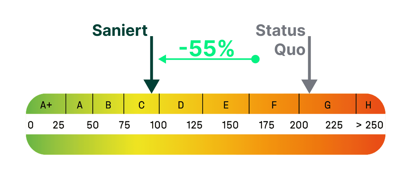 Bei dem Mehrfamilienhaus aus 1970 mit vier Wohneinheiten wurden die neuen Eigentümer im Zuge des Immobilienkaufs energetisch beraten. Im Vordergrund standen zwei Aufgaben: die Klärung der gesetzlichen Sanierungspflichten nach dem GEG sowie die Optimierung der Fördermittel hinsichtlich des besten Kosten-Nutzen-Verhältnisses. Als Ergebnis haben sich die Dachsanierung, Fassadendämmung, Fenstertausch und die thermische Abtrennung des Kellers ergeben, resultierend in einer Verbesserung des Gebäudes von Energieeffizienzklasse G auf C, die Heizkosten reduzieren sich um rund 55 %.