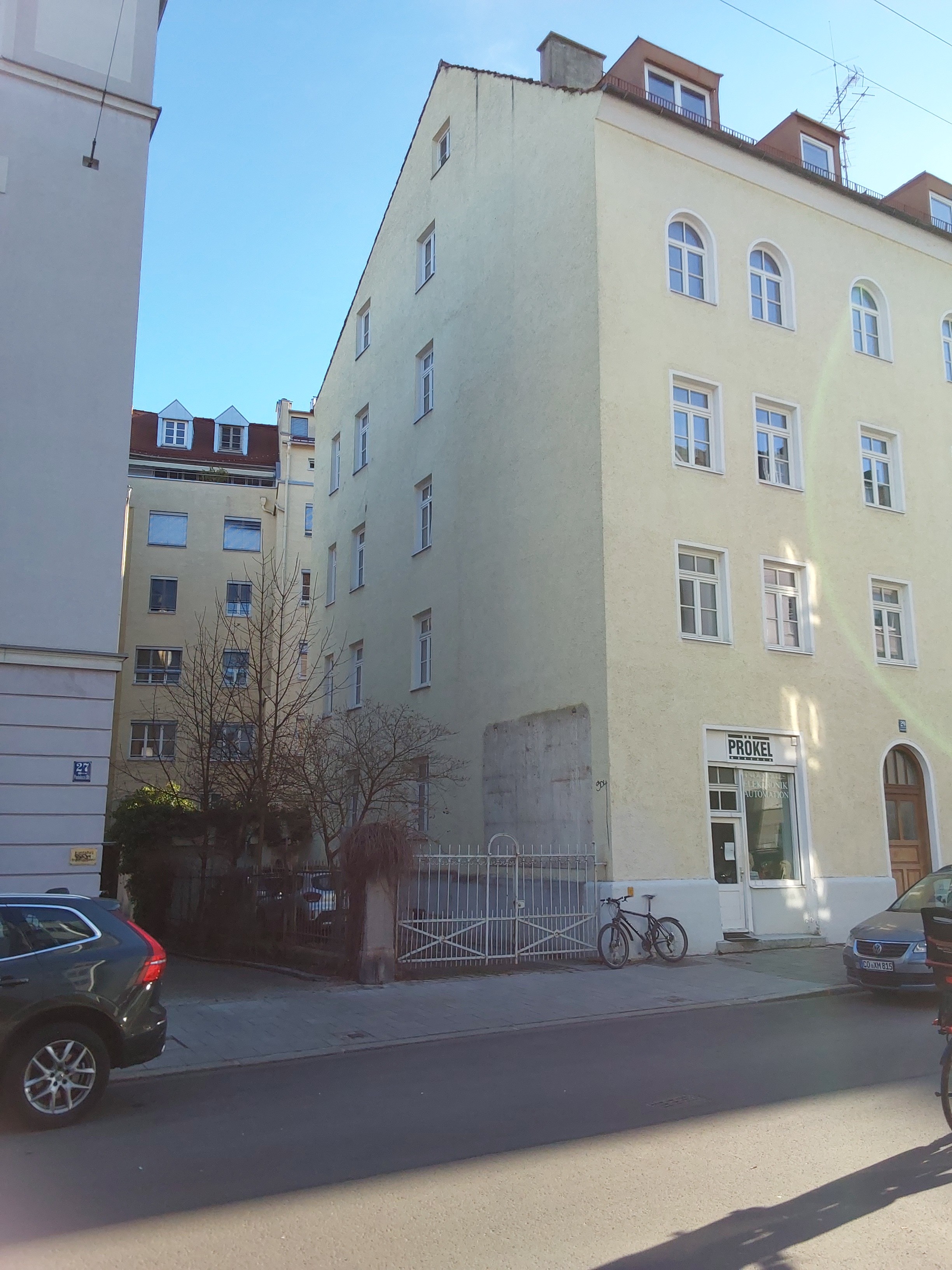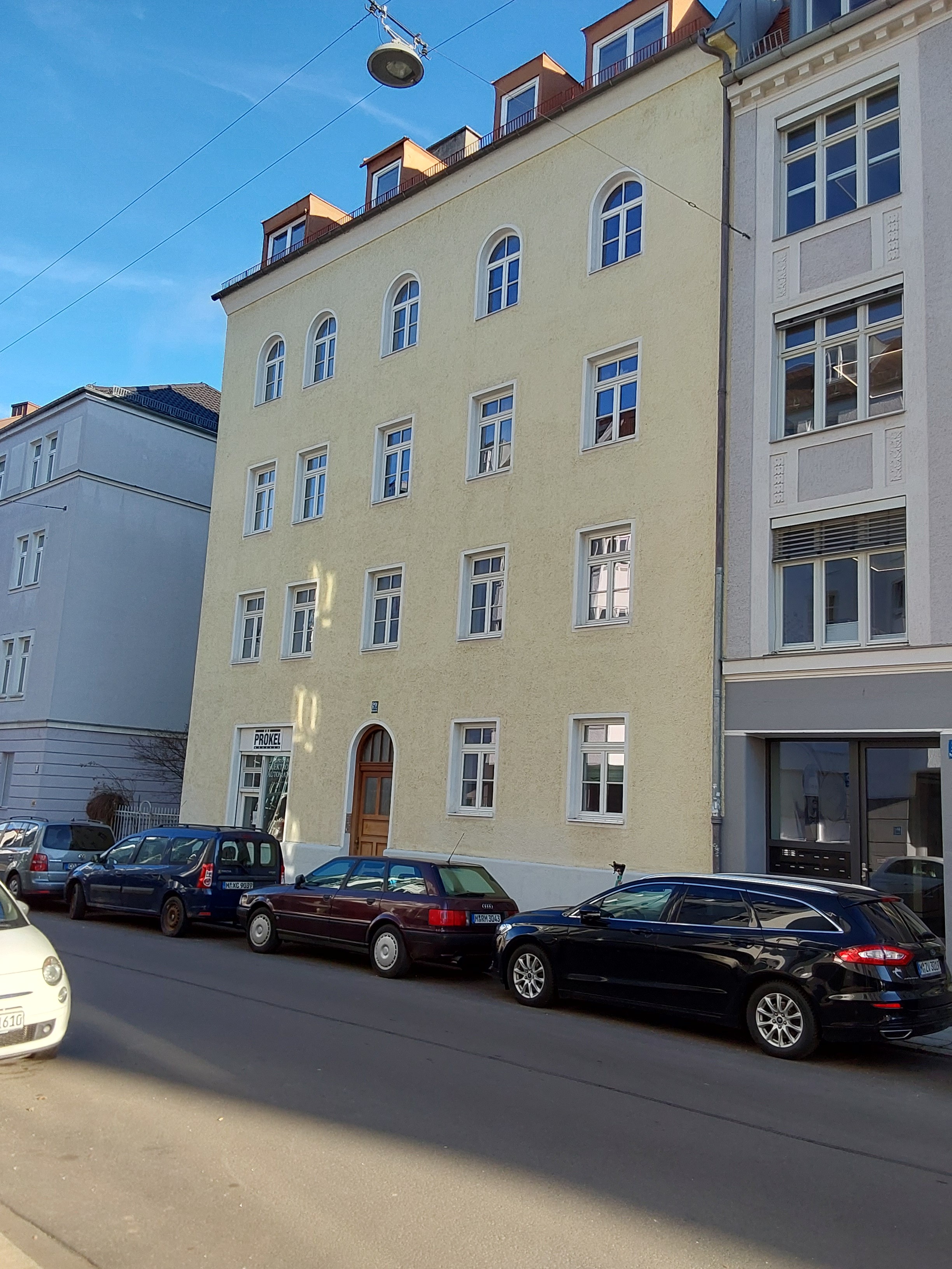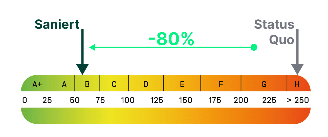 Das Mehrfamilienhaus von 1889 mit zehn Wohneinheiten wird im Auftrag des Eigentümers kernsaniert und um ein neues ausgebautes Dachgeschoß erweitert. Eine besondere bauphysikalische Herausforderung liegt in der thermischen Abtrennung zum unbeheizten Keller, da die historische Bausubstanz keine einfache Standardlösung zulässt. Die Sanierungsstrategie kombinierte Bundesförderung und das FKG-Förderprogramm der Stadt München, sodass ein Fördersatz von 35 % gesichert werden konnte. Umgesetzt werden Dachsanierung mit Dachgeschoßausbau, Fassadendämmung, Fenstertausch, Fernwärmeanschluss und der Einbau einer Fußbodenheizung. Das Gebäude verbessert sich von Klasse H auf B, die Heizkosten reduzieren sich um rund 80 %.