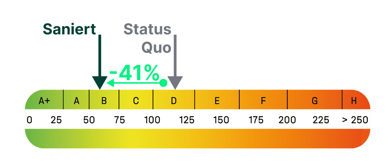 Für die Wohnungseigentümergemeinschaft mit 15 Einheiten in einem Bestandsgebäude von 1988 wurden im Zuge einer Energieberatung die optimalen Maßnahmen ausgearbeitet. In Kooperation mit einem Haustechnik-Büro werden die bestehenden Gas-Etagenheizungen auf einen zentralen Fernwärmeanschluss umgestellt, in Kombination mit der Dämmung der Fassadenrückseite. Die Erstellung aller relevanten Fördermitteldokumente und die Antragstellung erfolgt in Vollmacht für die WEG. Im Ergebnis verbesserte sich das Gebäude von Energieeffizienzklasse D auf B.