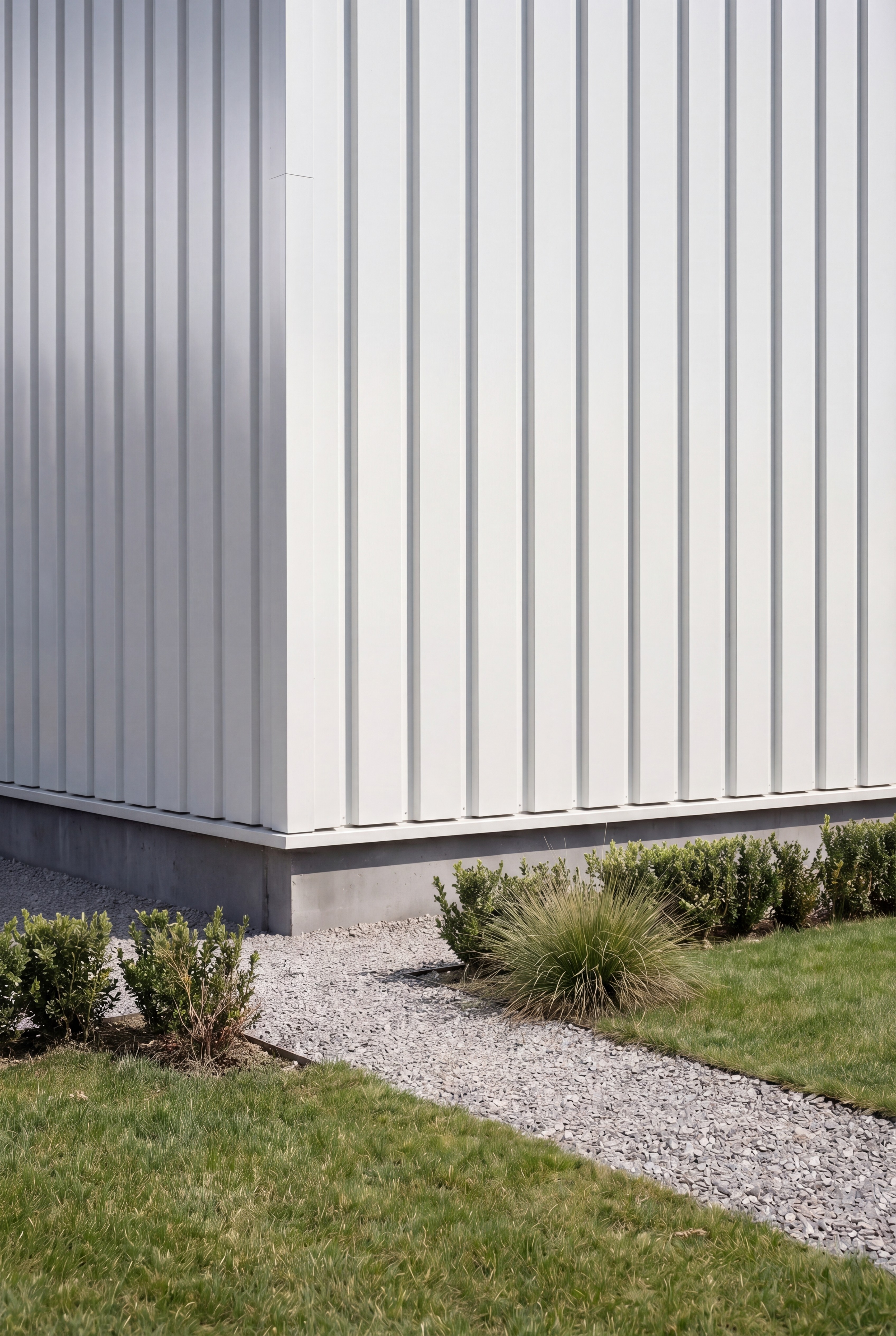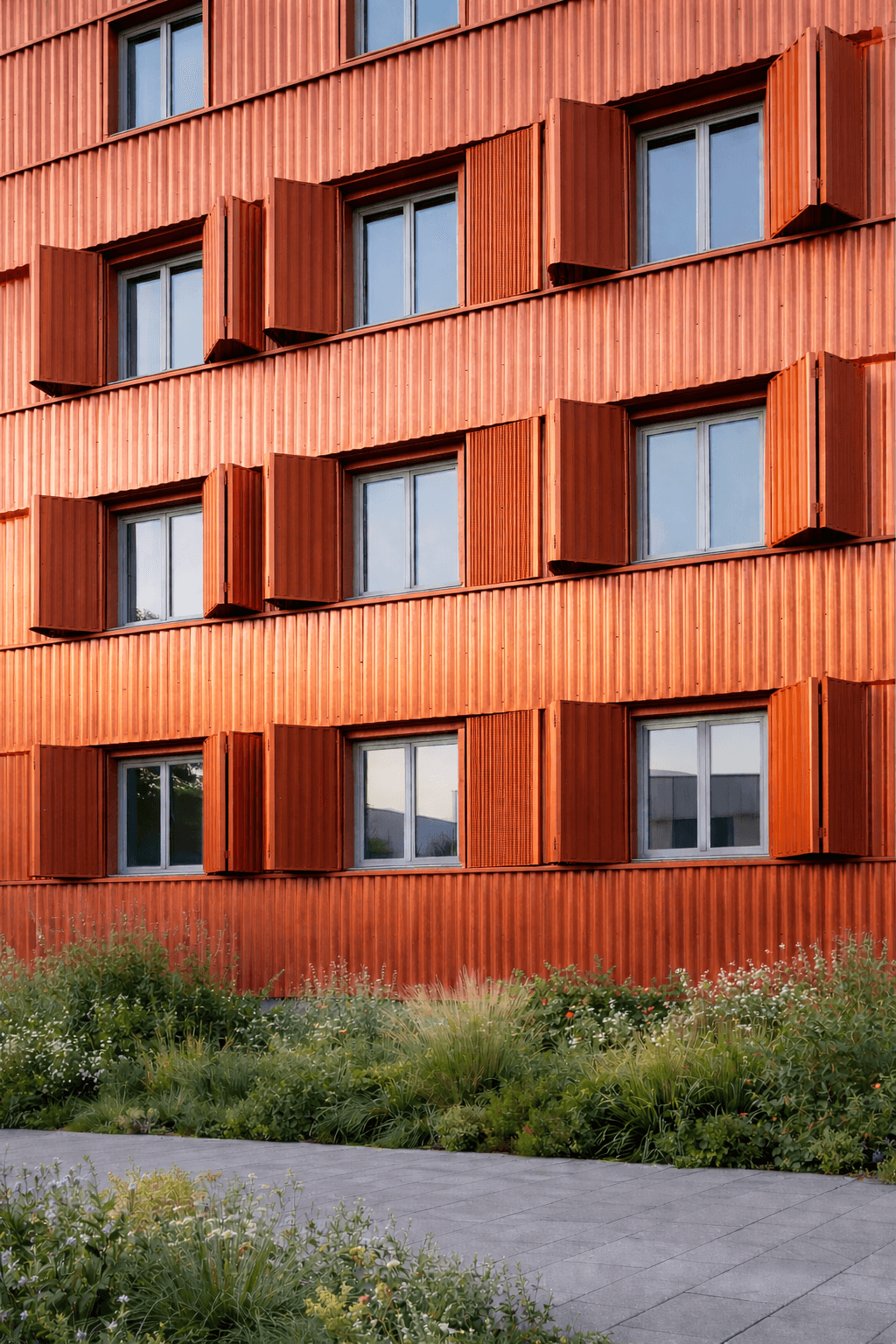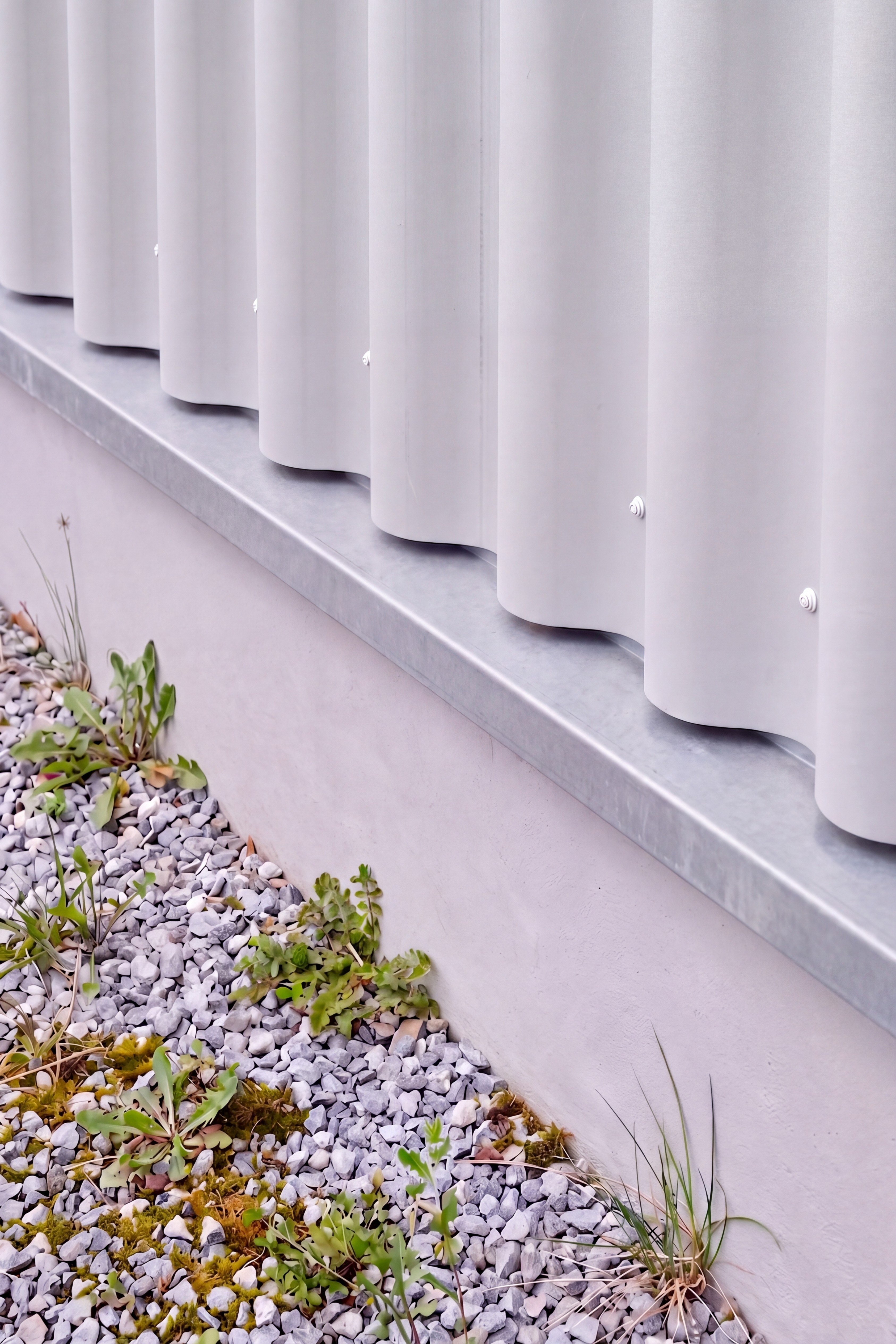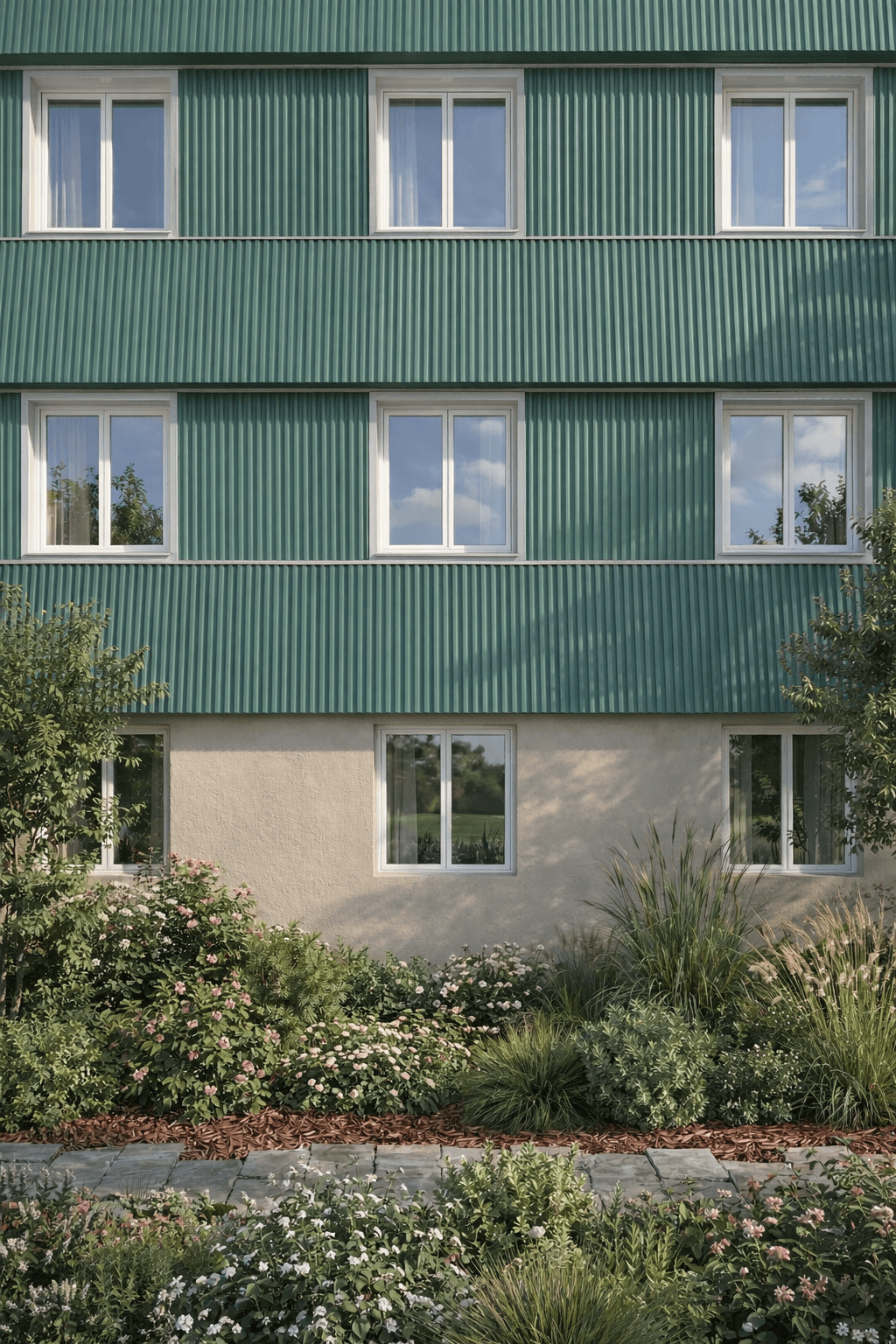 Die dcarbonize-Fassade aus witterungs- und UV-beständigem Trapezblech ist hinterlüftet, trocknet schnell und verhindert Feuchte, Algen und Verfärbungen. Ergebnis: langlebig, optisch stabil und wartungsarm über den ganzen Lebenszyklus.