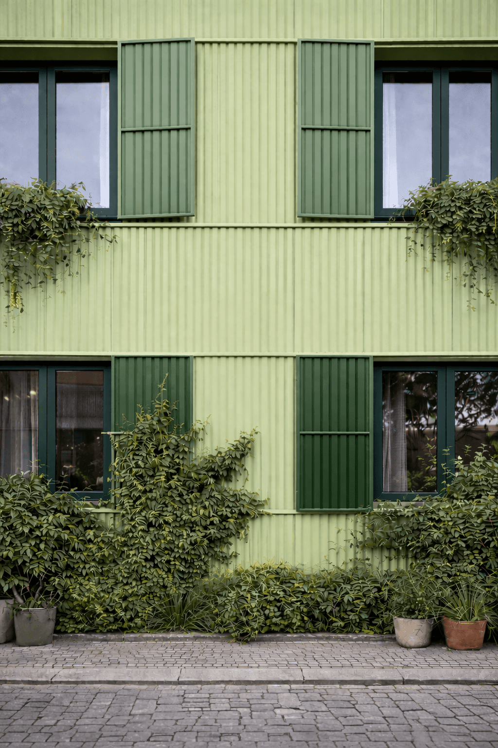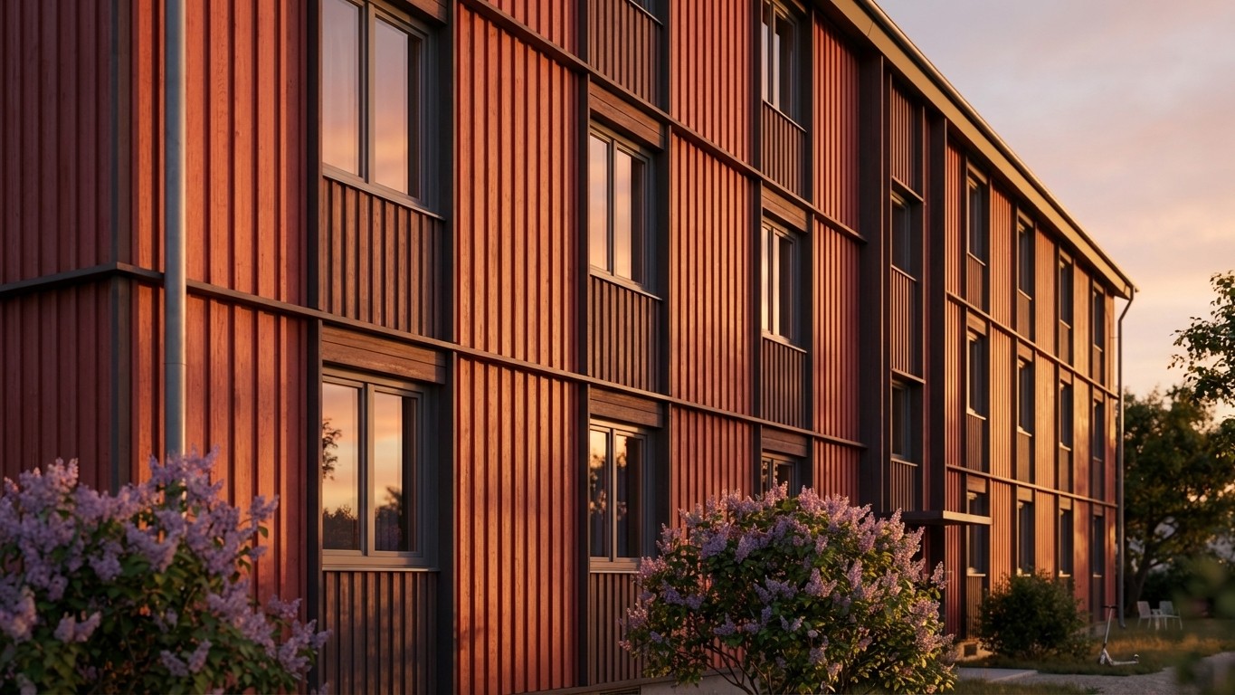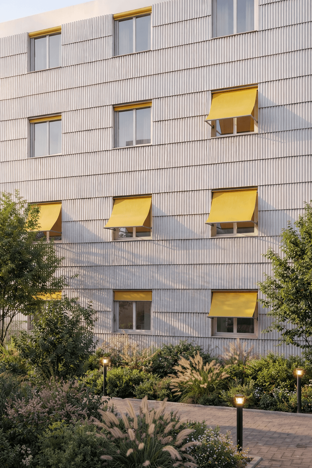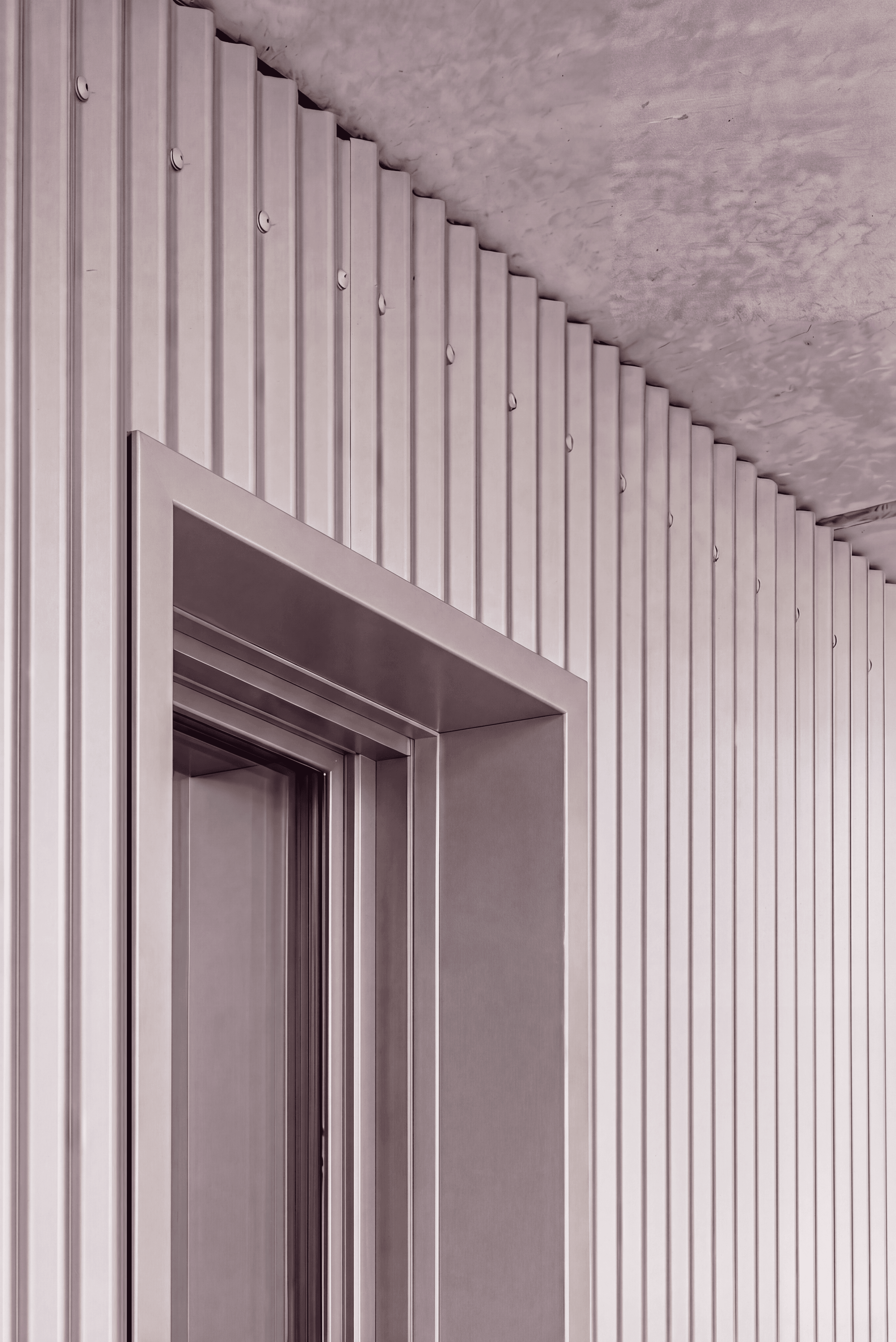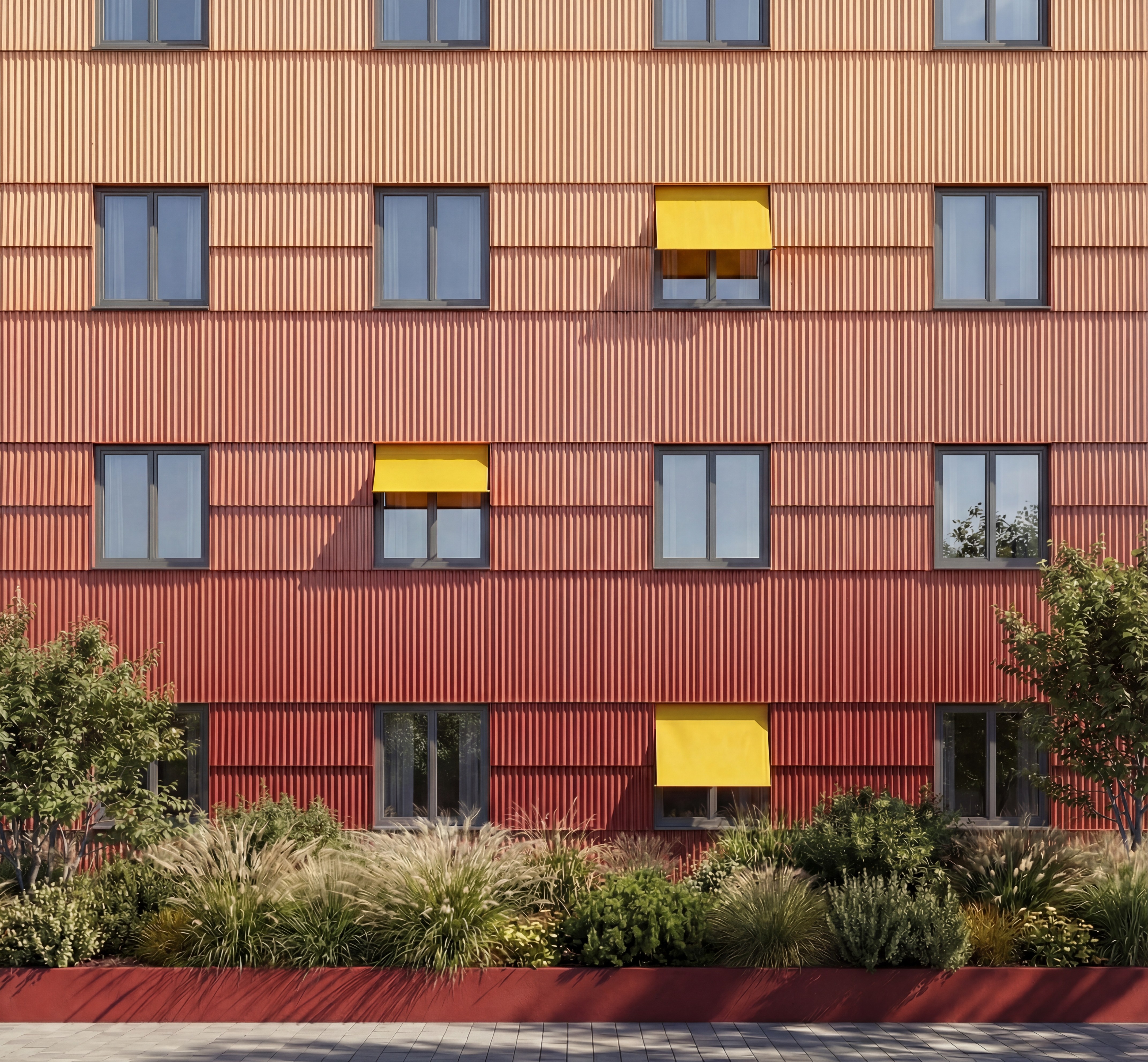 Die dcarbonize-Fassade aus witterungs- und UV-beständigem Trapezblech ist hinterlüftet, trocknet schnell und verhindert Feuchte, Algen und Verfärbungen. Ergebnis: langlebig, optisch stabil und wartungsarm über den ganzen Lebenszyklus.